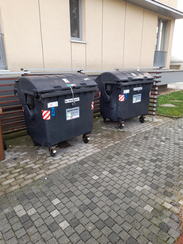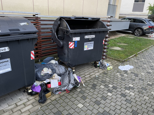 Nepořádek okolo popelnic. Někdo asi vybíral poklady, protože podobný nepořádek je i u nejbližšího sousedních popelnic v ulici Olgy Havlové a v ulicí Pod Jarovem