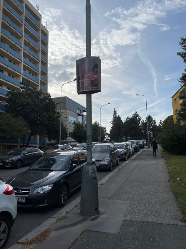 Tato reklama na veřejném osvětlení je nelegální, na Praze 3 je to zakázané, tak nahlašuji.