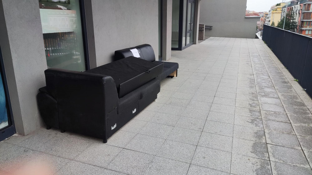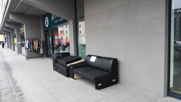 Roháčova 46, Praha 3, u vchodu do domu je odložený starý , mírně poškozený, černý gauč.