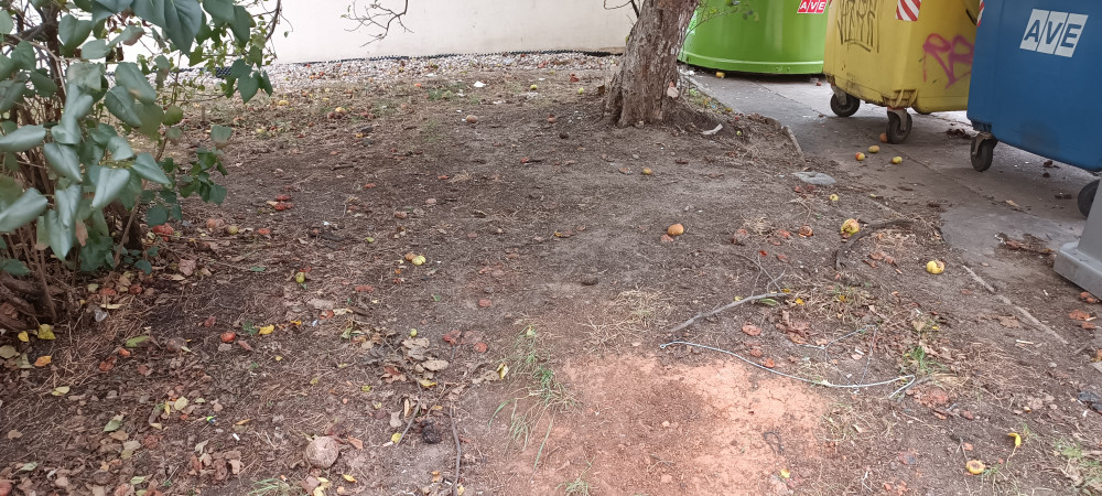 Nepořádek pod stromy, napadaná hnijící jablka, polámané větve