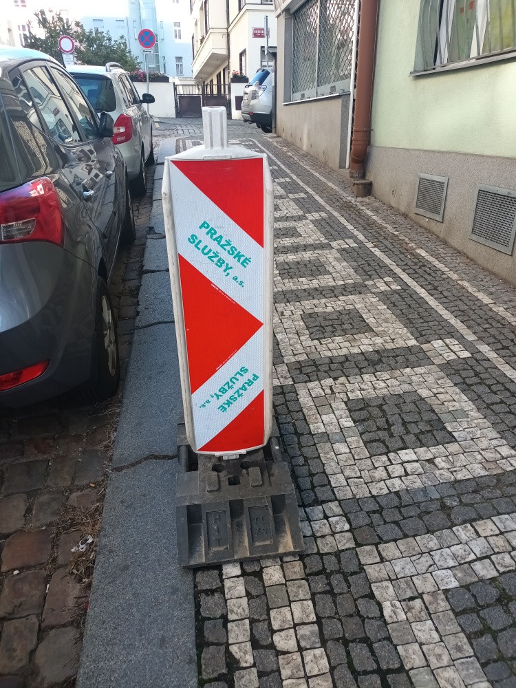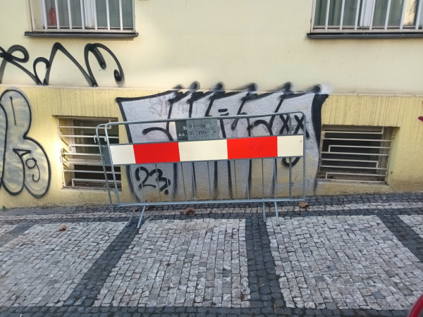 Pražské služby si zde nechaly zábrany, chodník je již přes týden opravený. Husinecka 4 a u domu Husinecka 3