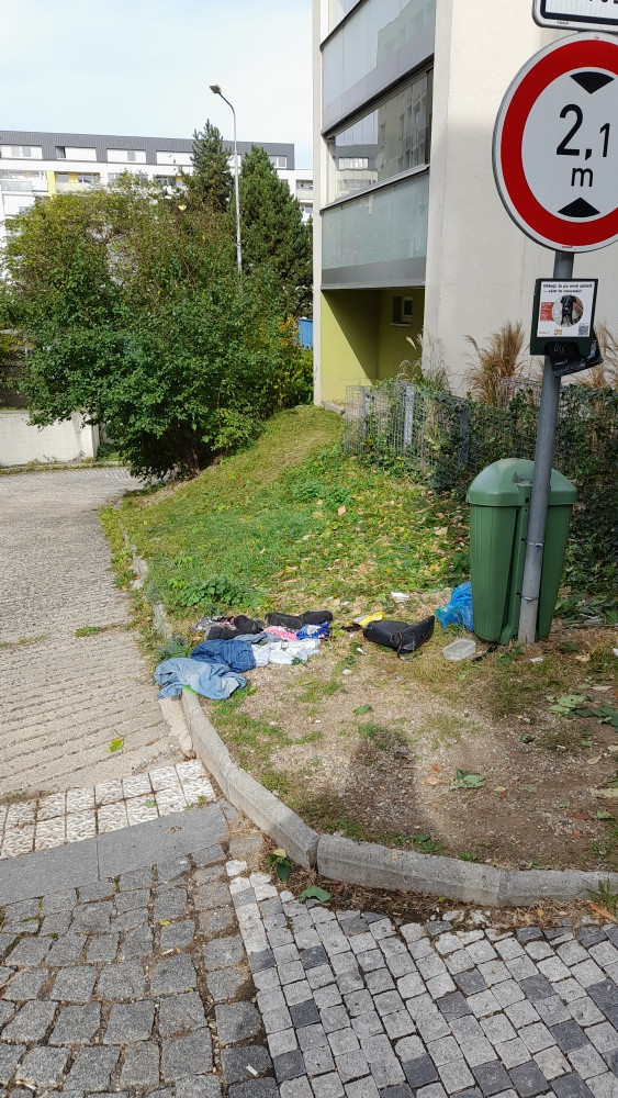 nepořádek- hadry okolo koše na PE v Jesiniově ulici