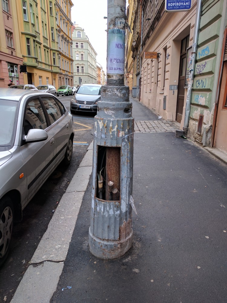 Chybějící kryt na pouličním osvětlení. Nebezpečí úrazu elektrickým proudem.