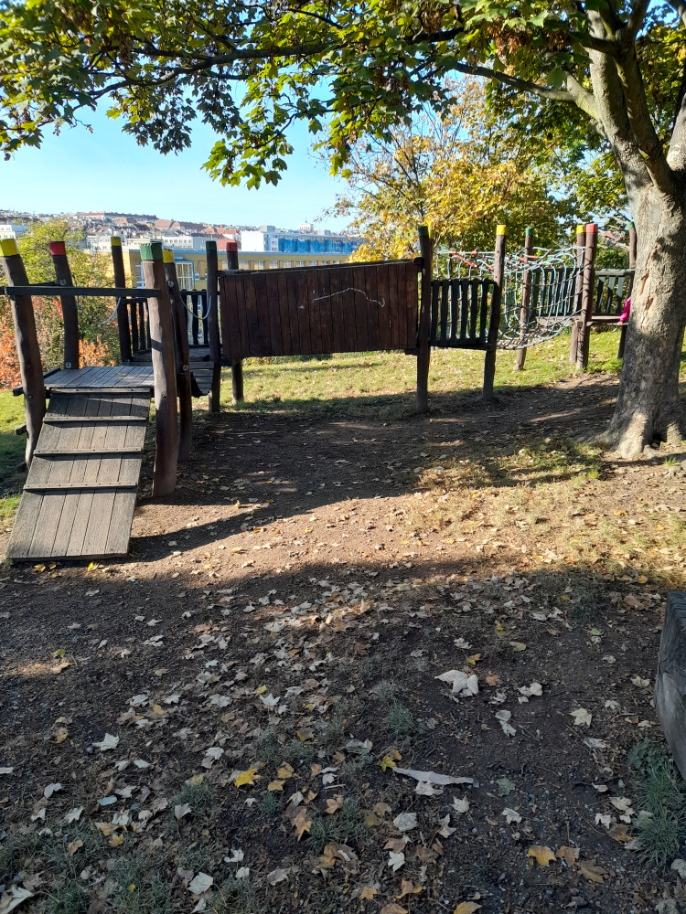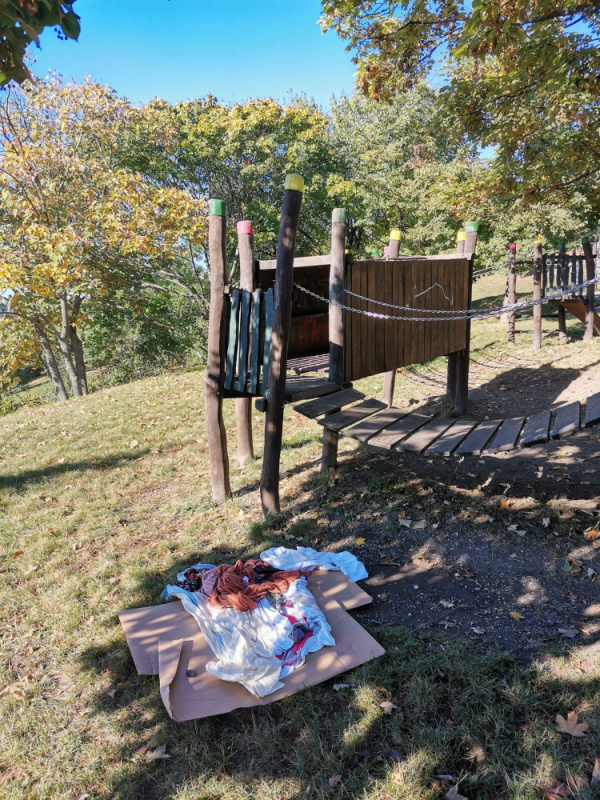 Odpadky a hadry po bezdomovcích původně v herním prvku, vyhodili jsme je na zem. Opičí dráha na hřišti Parukarka, kde je nejdelší klouzačka.