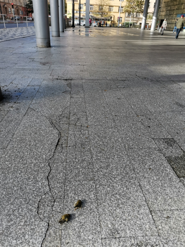 Mrtví ptáčci na chodníku z pravé strany OC Flora