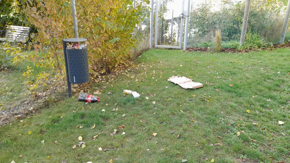 na DH Horní Stromky lahve od alkoholu, sklo, a odpadky okolo koše