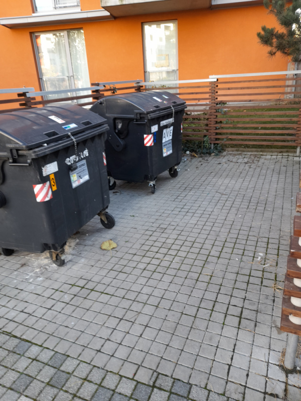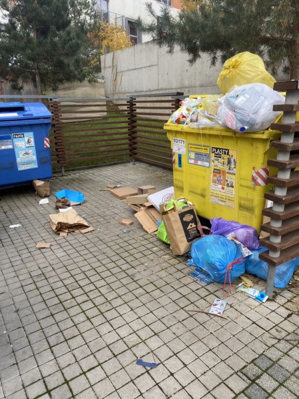 Preplnene popelnice a neporadek v okoli trideneho odpadu