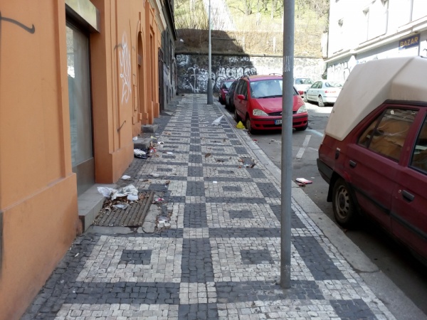 Dnes 13h. Rozbitý a přeplněný kontejner na papír Jeronýmova, Husitská, chodníky plné papírů z kontejneru. Kontejner má utržené víko.