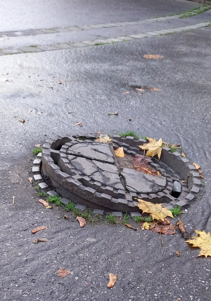 Na Škroupově náměstí je v chodníku napůl zvednutý poklop kanálu.