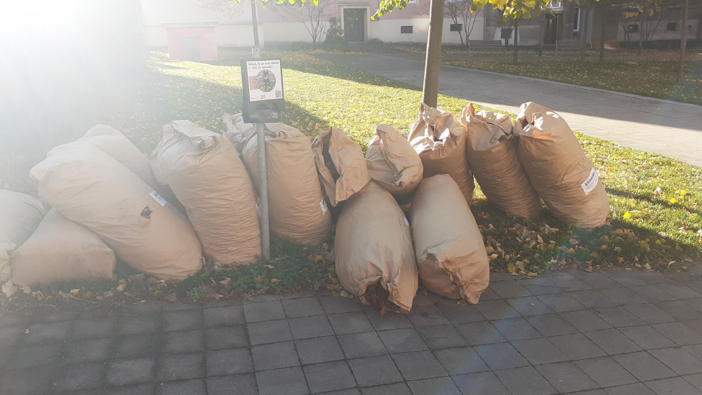 Ve vnitrobloku posbírali dobrovolníci listí z jírovců kvůli nežádoucímu šíření klíněnky jírovcové. Listí dali do speciálních pytlů s označením a nyní čekají pytle na odvoz, předpokládám, že má zajistit společnost AVE. Bohužel ale o nich AVE při svozu neví, protože jsou uvnitř vnitrobloku, přestože hned u vchodu. Pytle tu leží už delší dobu.