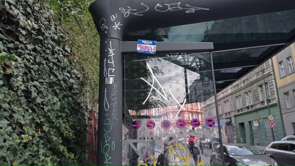 Na autobusové zastávce U Památníku směr centrum je již delší dobu počmáraný přístřešek pro cestující.