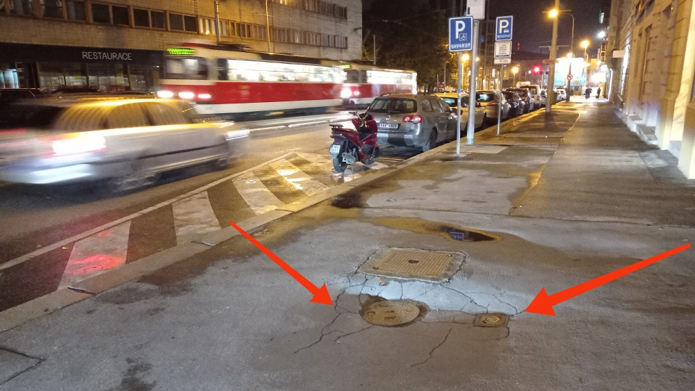 V ulici Seifertova se naproti vyústění ulice Siwiecova nachází již dlouhou dobu částečně propadlý asfalt chodníku.