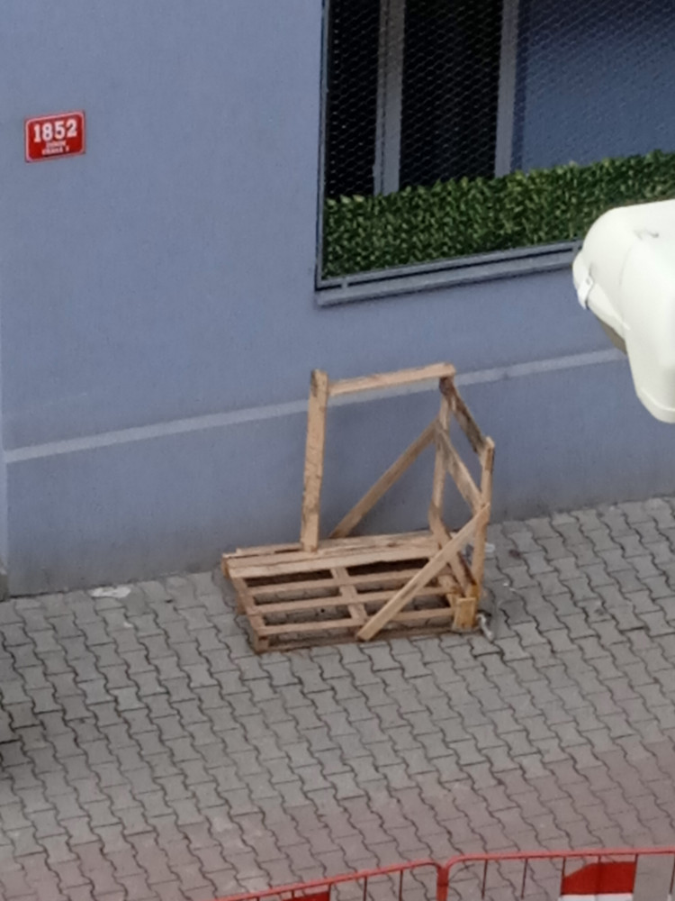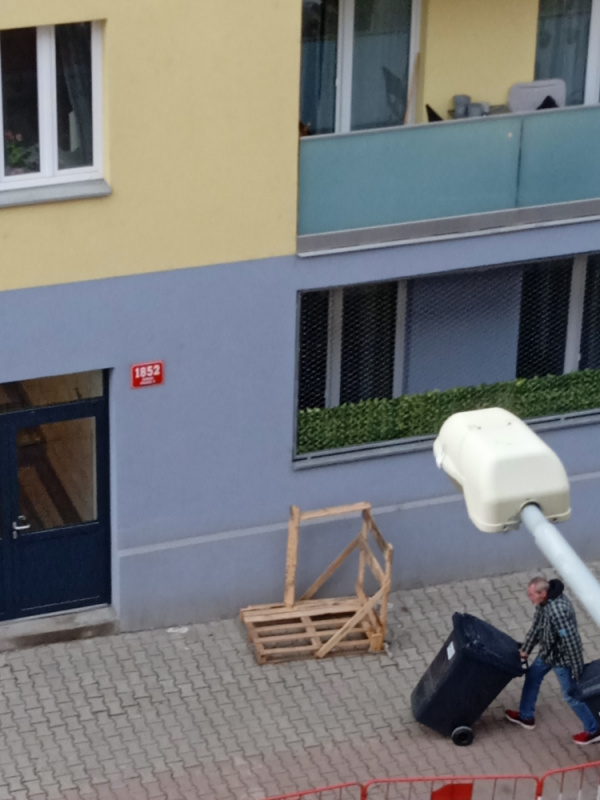 Odhozená paleta u domu Ambrožova 7 Praha 3 Žižkov (někomu přivezli tv na té paletě a on ji takto nechal před domem.