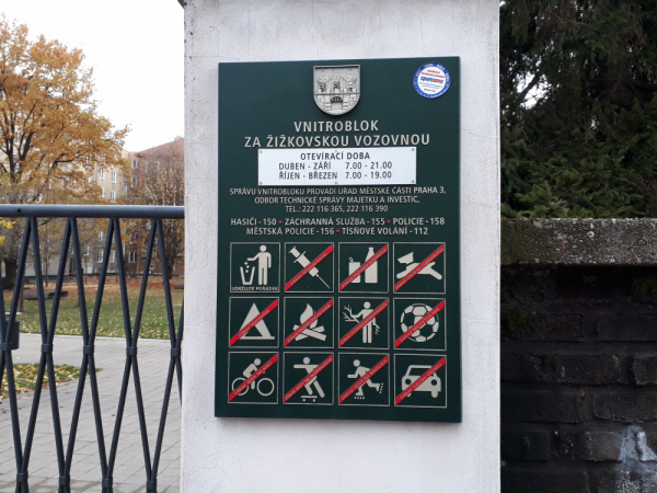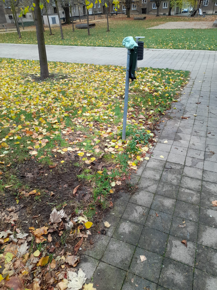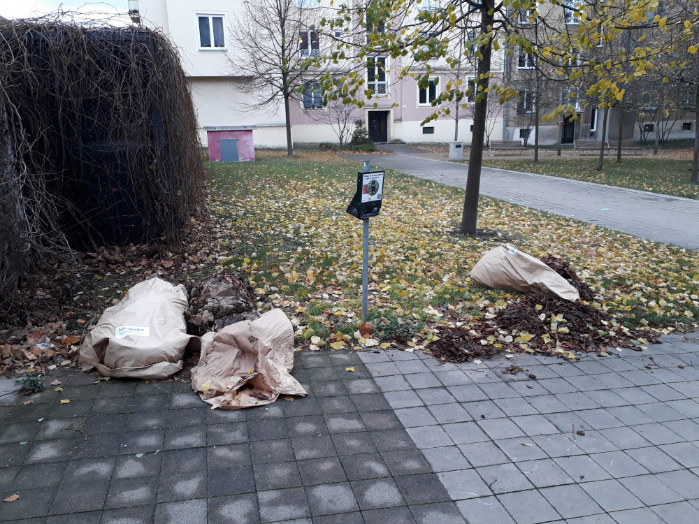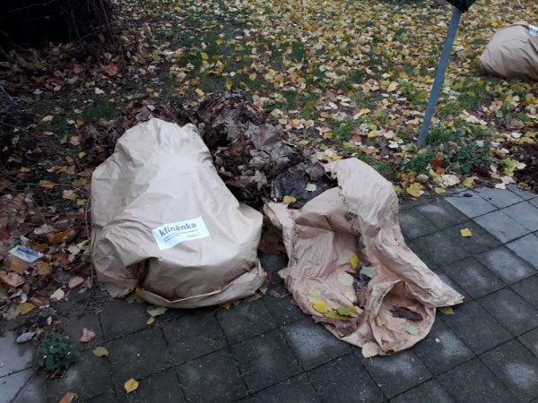 Ve vnitrobloku, přístupném z ulice Za žižkovskou vozovnou, jsou tři papírové pytle s listím, označené Klíněnka, které se již rozpadají.