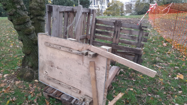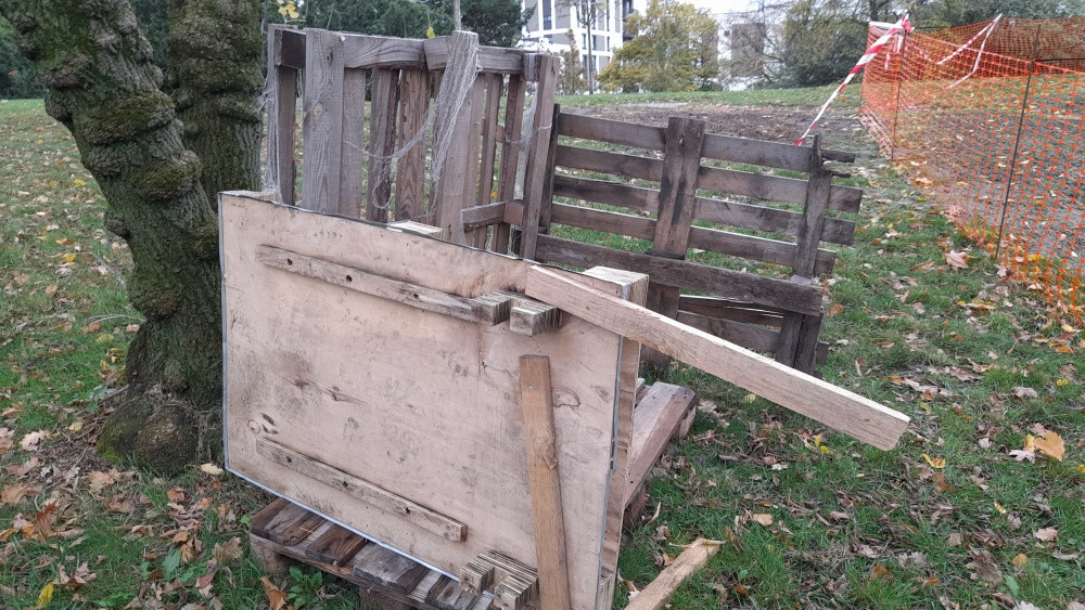 Židovské pece - nějaké stlučené palety na trávníku vedle Fitness Jilmova