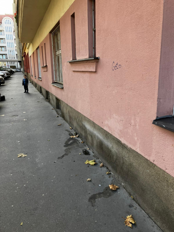 Velká plochá deska/bývalý stůl nebo dveře opřené o dům Buchovcova 1705/7 (za obchodem ovocem a zeleninou) + nepořádek mezi zaparkovanými auty tamtéž.