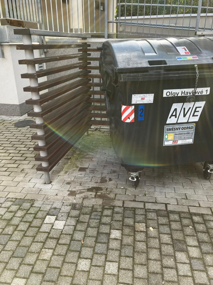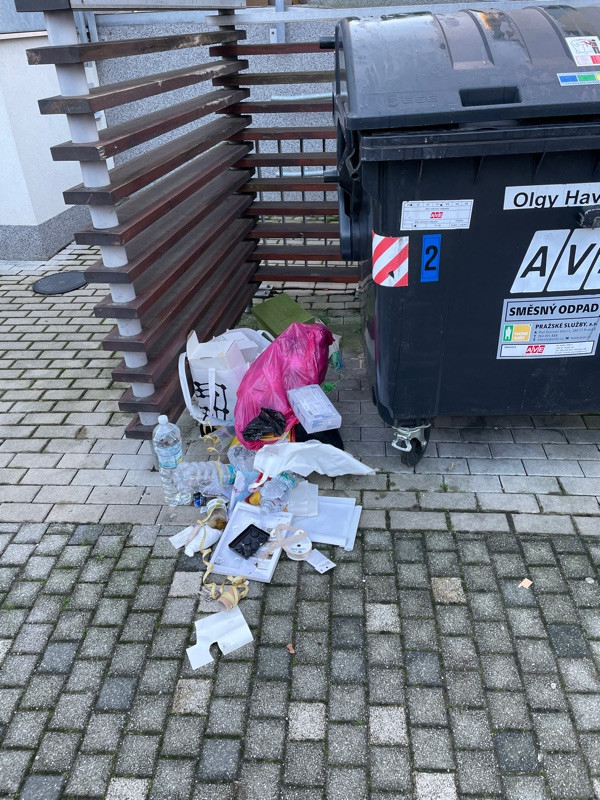 Hezky den prosím o úklid nepořádku u popelnic po včerejším dešti to bohuzel nejde nabrat přes tašky