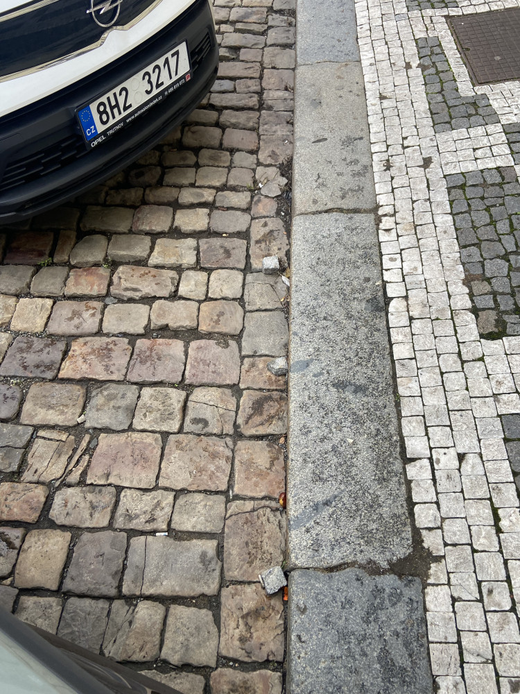Dlazebni kostky z chodnikove mosaiky jsou pohazeny ve vozovce