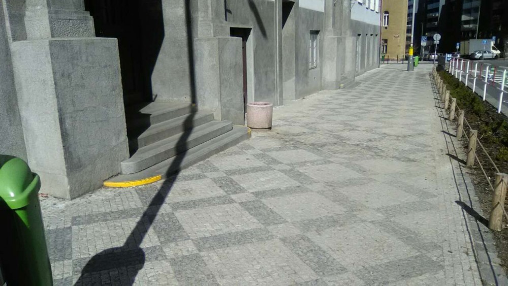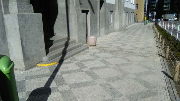 Rozbitý chodník! Přímo před vstupem do školy. Již tam došlo k úrazu.