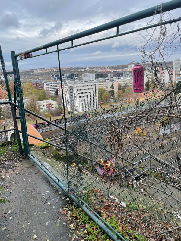 Nebezpecne zdemolovany plot/ branka u schodu, vedoucich k vlakovym kolejim