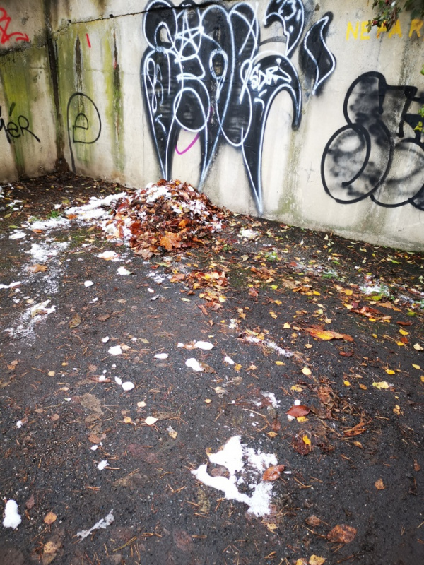 Nafoukane listí a odpadky před garážemi na pozemku HMP Praha 3