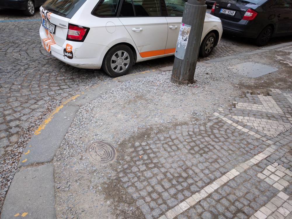 Pravděpodobně nedodělaný chodník po opravě něčeho pod zemí. Osadit kostky nazpátky se už zřejmě nikdo neobtěžoval.