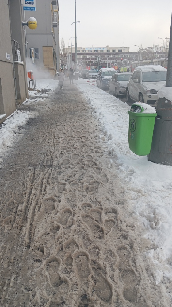 Nešlo by s tím prosím něco udělat? Jak v tomhle mám projet kočárkem? Je hezké to posypat ovšem když se ten sníh rozpustí tak je potřeba to shrabat. Nechápu jak je toto možné na hlavní ulici. Děkujeme