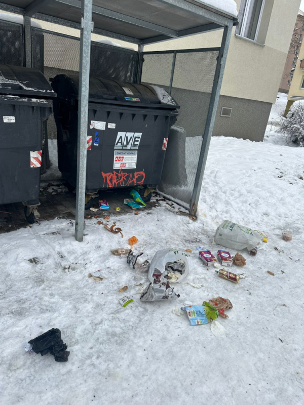 Děkuji za uklizení, avšak bylo by vhodné najít nějaké dlouhodobější řešení . pravděpodobně opravit dveře, aby nedocházelo k opakovanému vyhazování odpadu z kontejnerů. Osobně jsem viděl i ptáky, jak to rozhazovali, ale nejčastěji je to "hrabáním" bezdomovců, ale také ponecháním odpadu u kontejneru od toho co to přinesl, ale dovnitř nehodil. Ještě jednou děkuji a jsem s pozdravem Jaroslav Hüttl