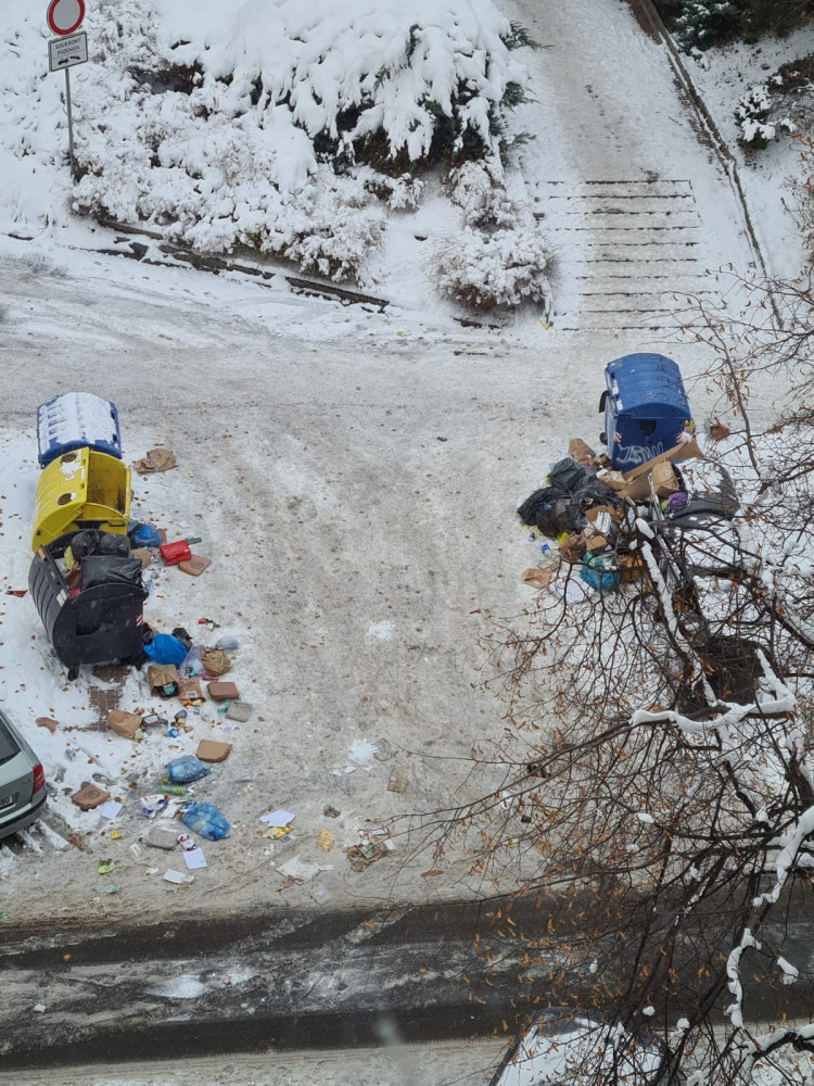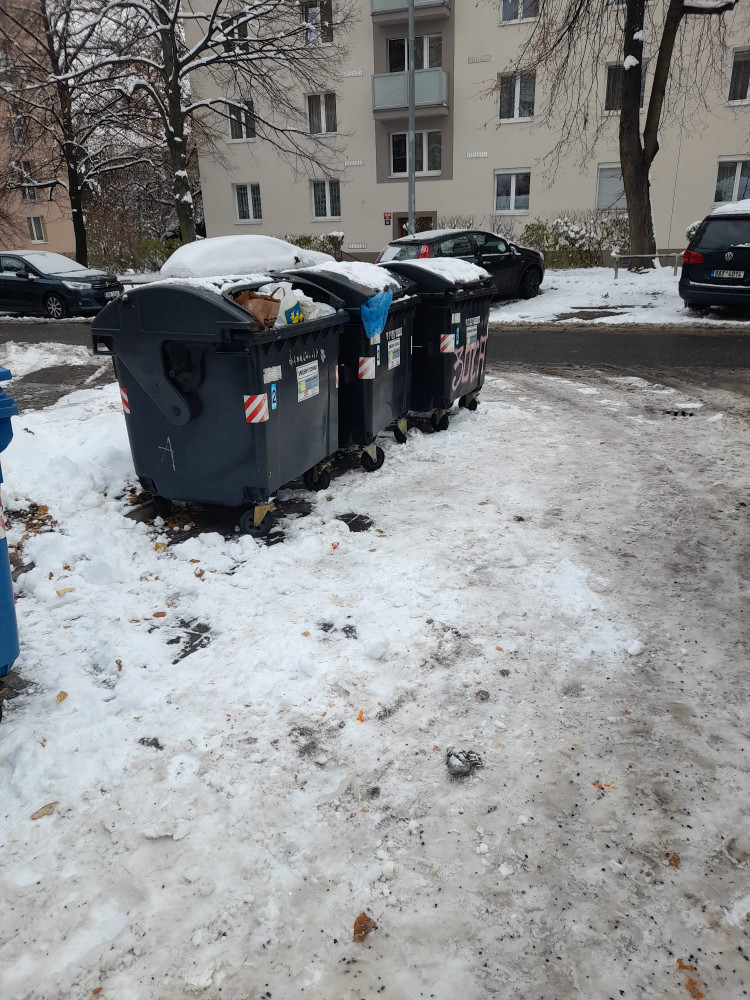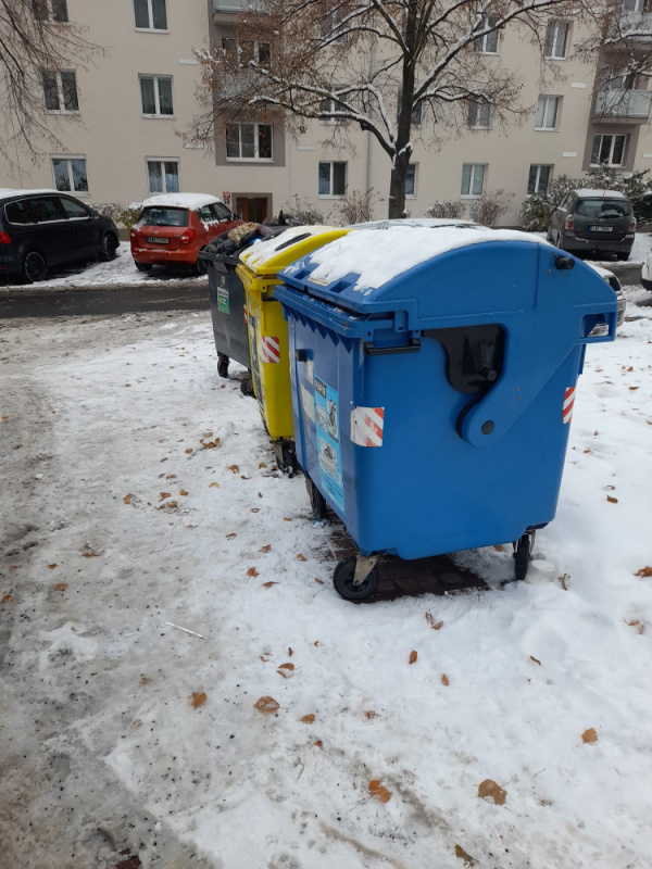 Od včerejška nepořádek kolem kontejnerů na odpad, jako by jeden kontejner chyběl. Před kolejemi, Pod Lipami 43.