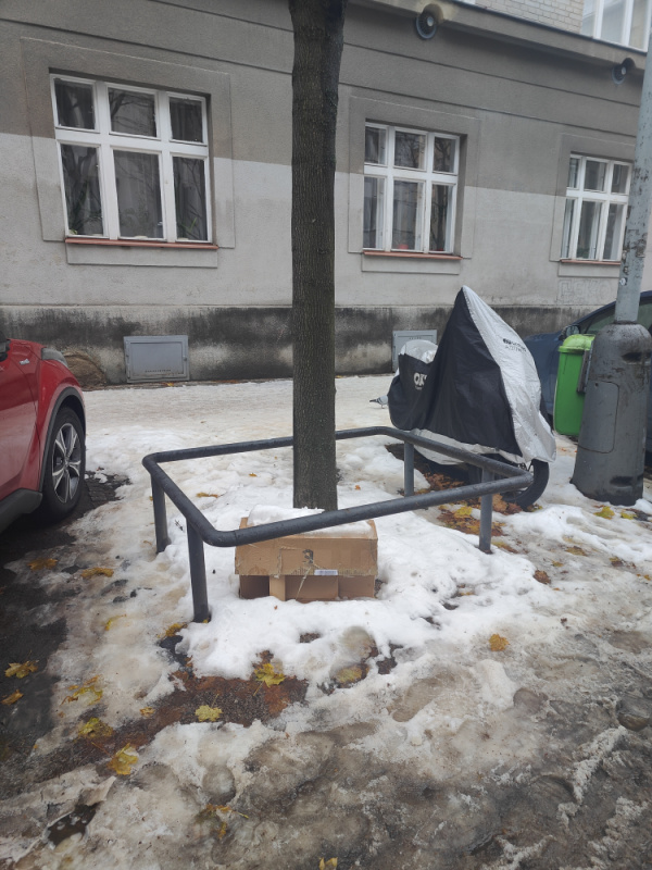 Odhozená krabice v rabátku v Laubově ulici naproti domu č. 10.