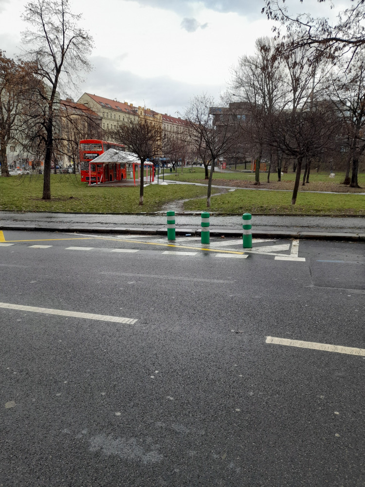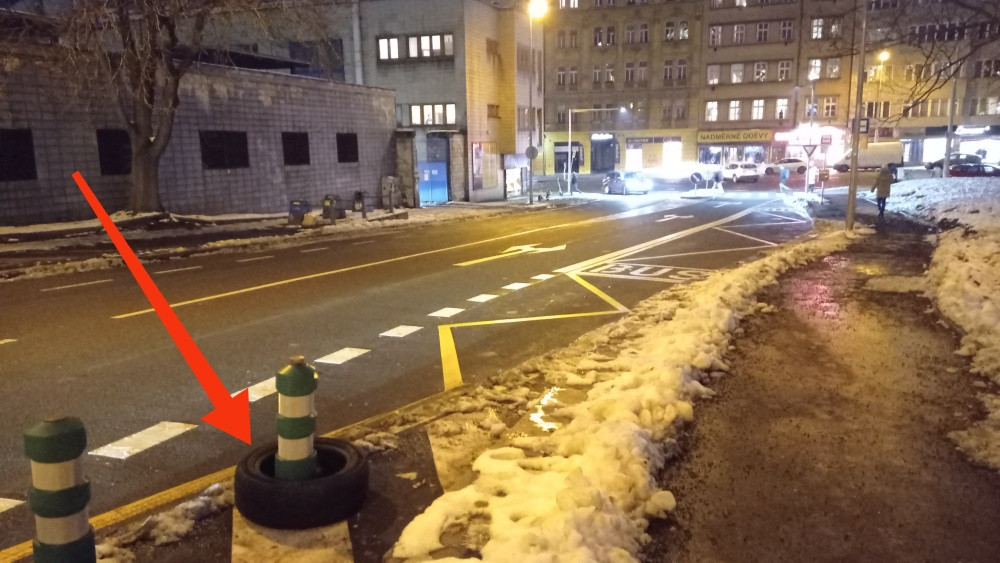 V ulici Siwiecova je u autobusové zastávky Viktoria Žižkov pohozená pneumatika.