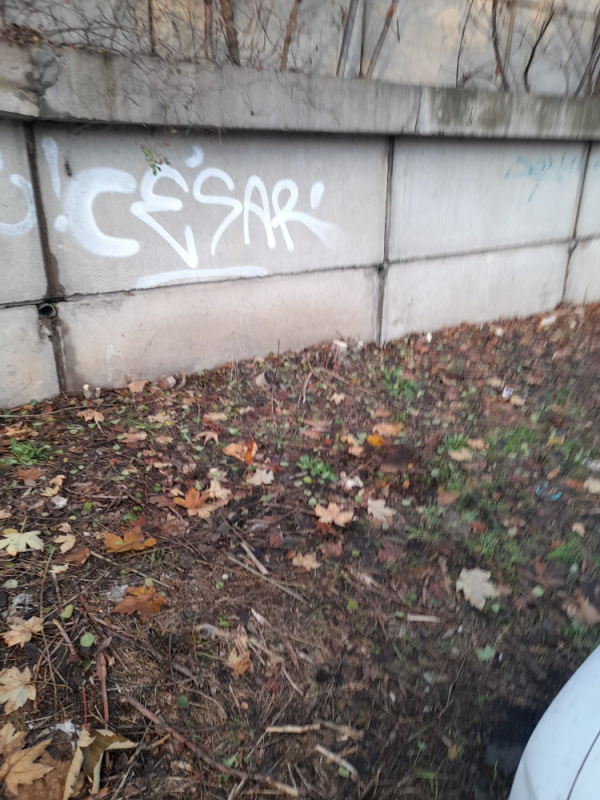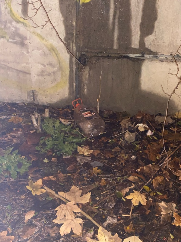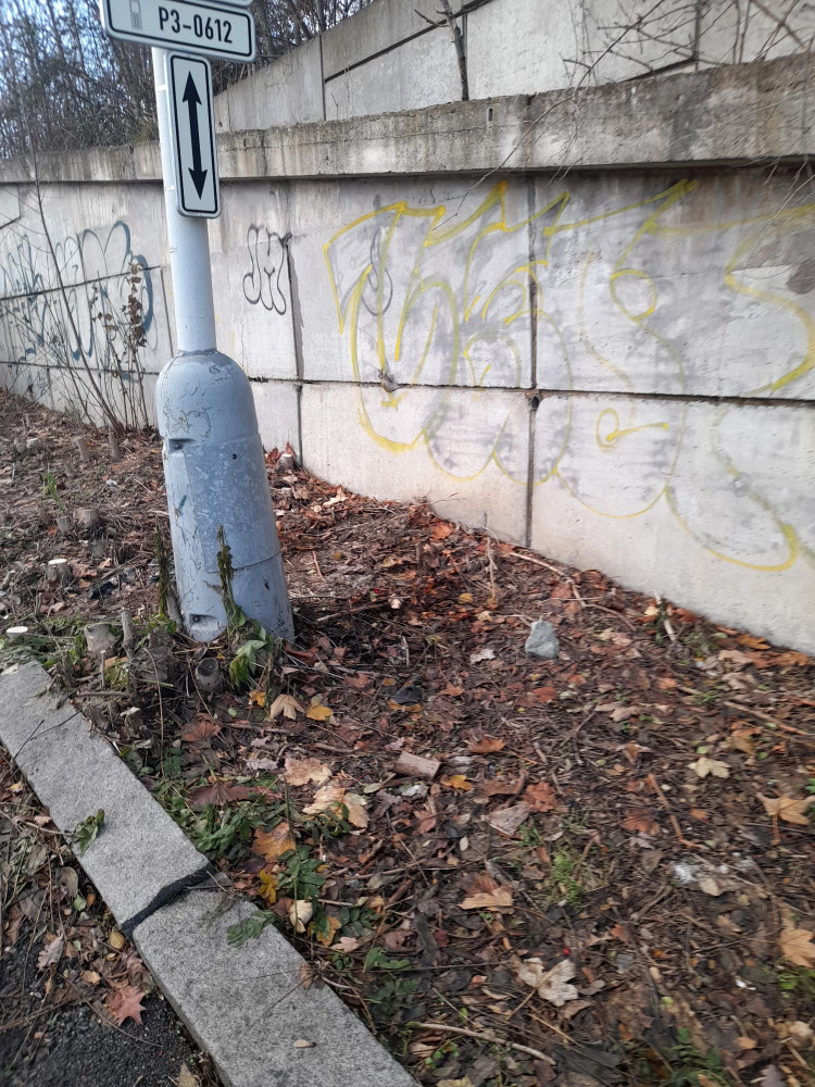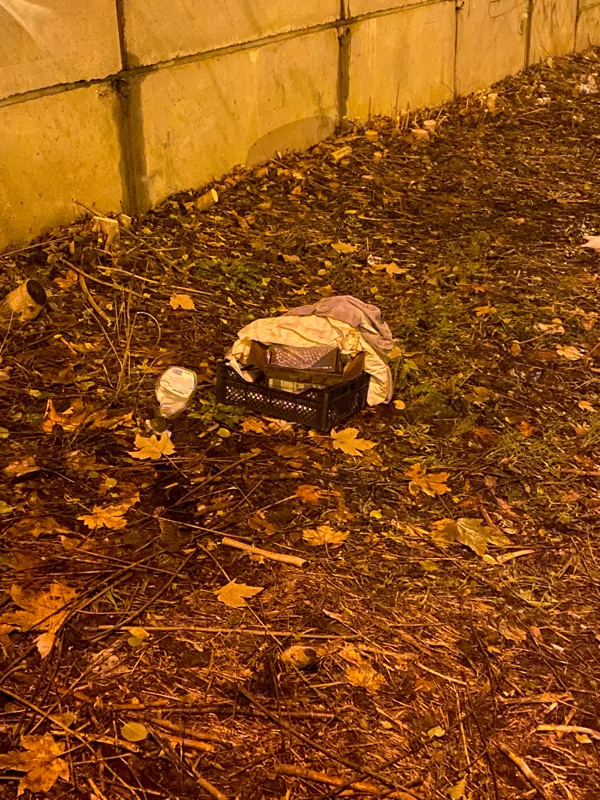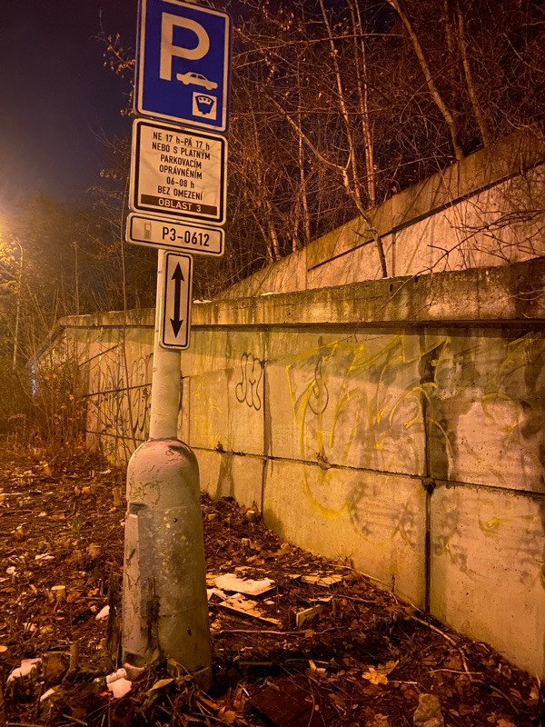 Odložena přepravka s nějakým bordelem, plastová velká láhev a zbytky asi z nábytku. Vše kolem vyfocene cedule, ze silnice není vidět přes zaparkovana auta.