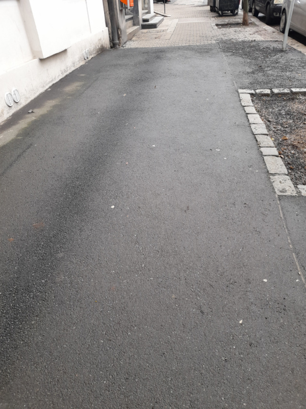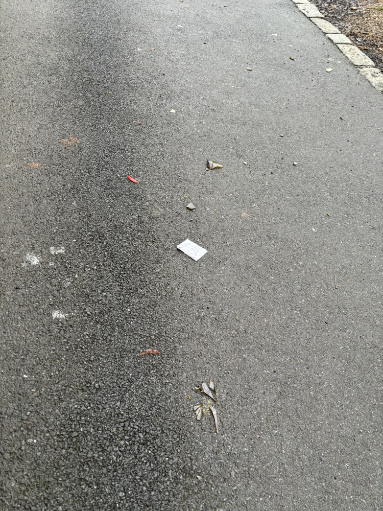 Sklo (nejspíš rozbita láhev) na chodniku. Cca před vchodem do domu v ulici Kubelíkova č. p. 18