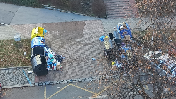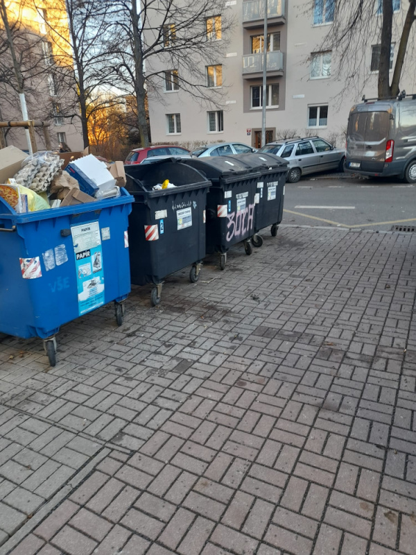 Celý týden nepořádek kolem kontejnerů, v pondělí to obvykle uklízí pracovník kolejí, posbírá ze země a nahází do kontejnerů, takže to odvezou, dnes nepřišel. Před kolejemi, Pod Lipami 43.