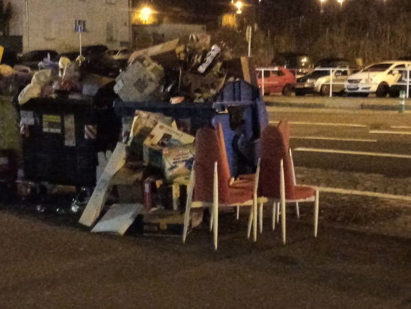 bordel z blízké čínské restaurace u tříděného odpadu. majitel restaurace si zřejmě neuvědomuje že použity nábytek- židle nejsou tříděný odpad.