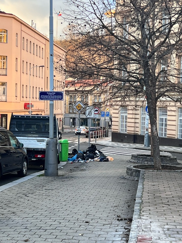Na Prokopove namesti pobliz kontrjneru si nejaky bezdomovec udelal hnizdo z odpadku