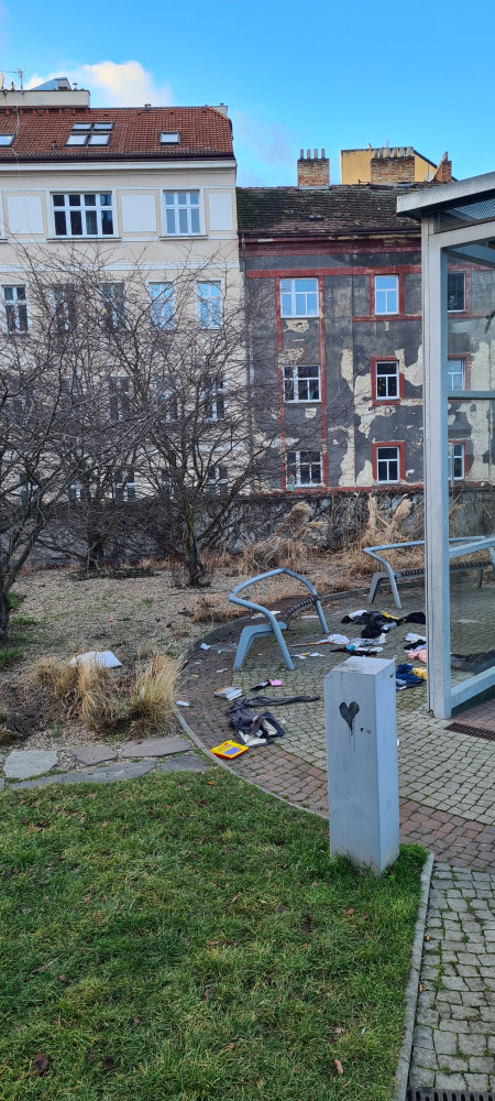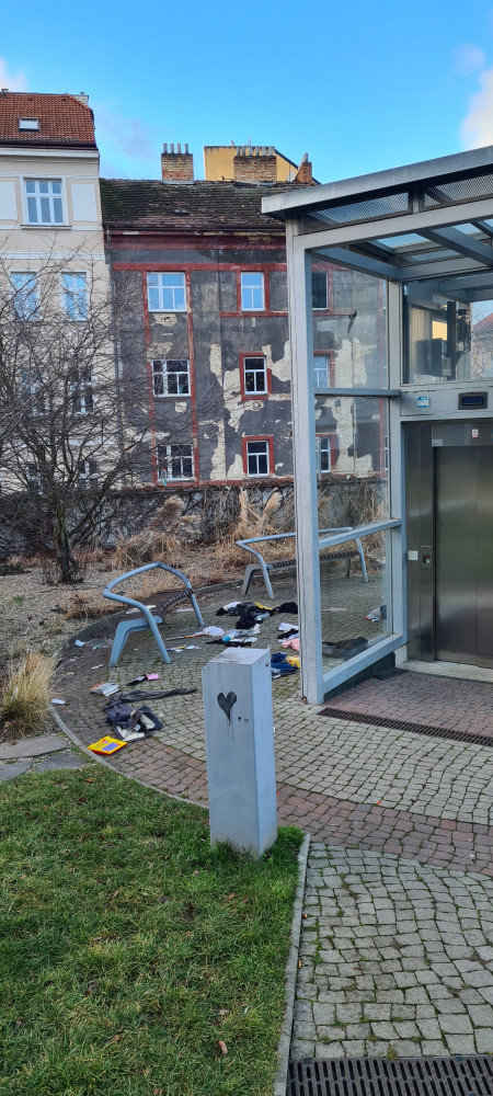 Nepořádek kolem výtahu do garáží Lupáčova