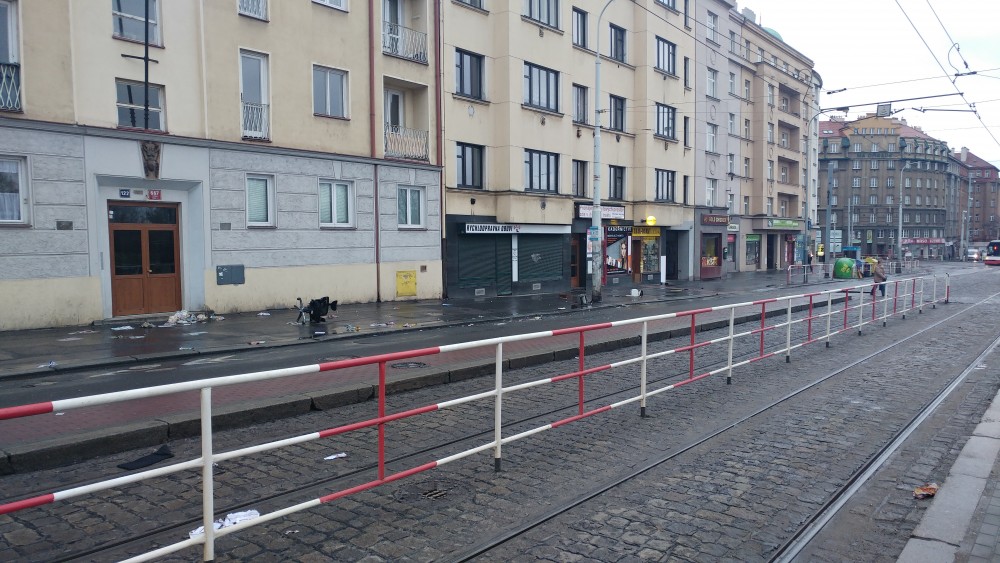 Koněvova 122, chodník zaneraden odpadky, židle, papíře, apod