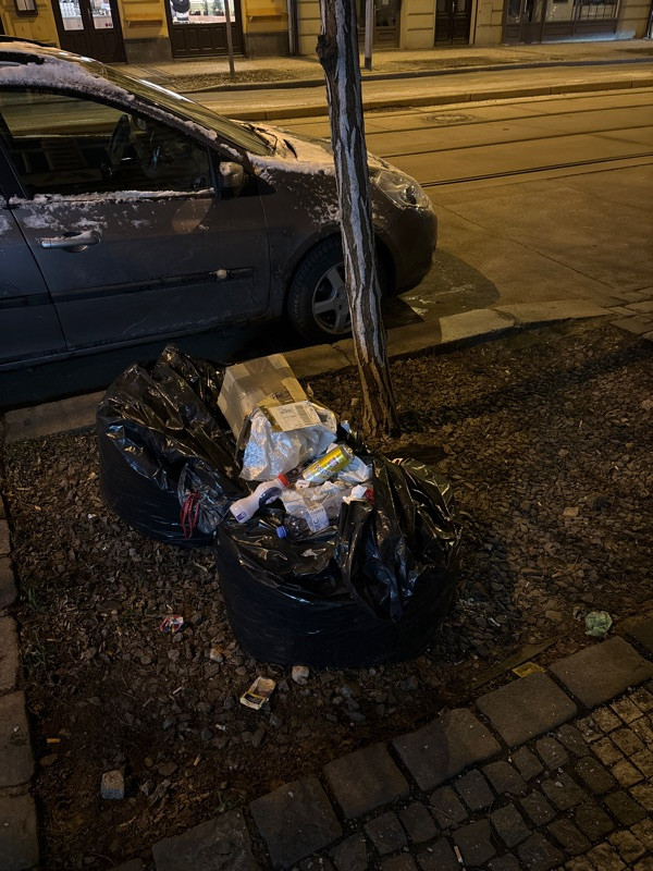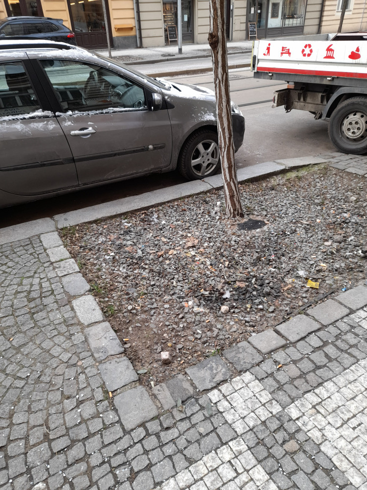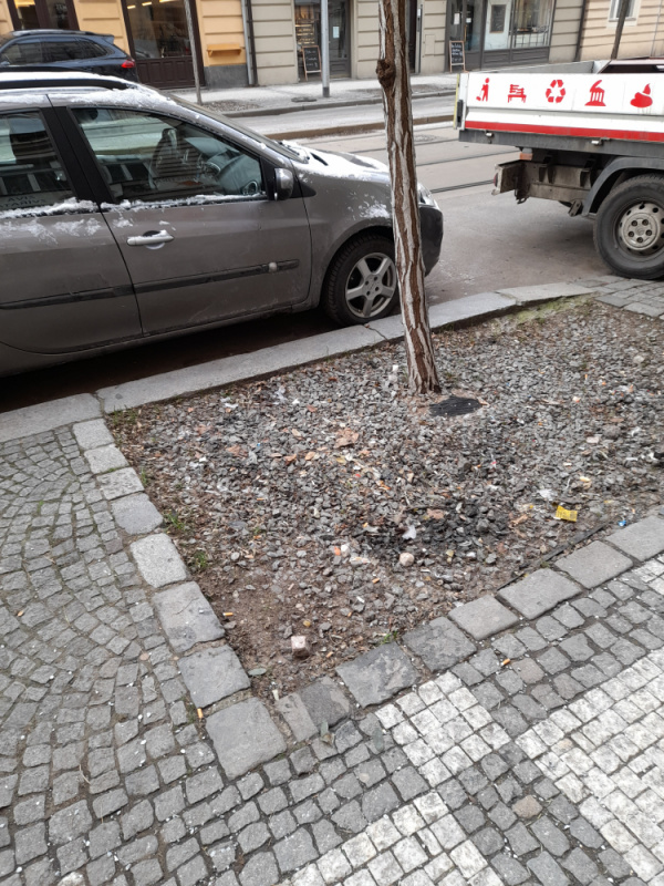 Odpadk na chodniku u stromu.