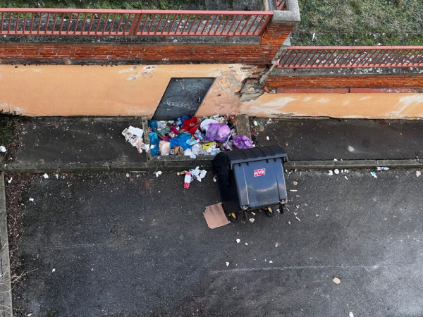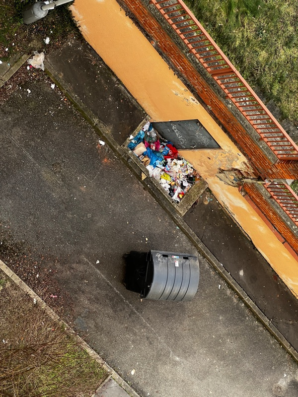 Vysypaný kontejner + povalený kontejner na smíšený odpad v slepé ulici ve vnitrobloku - v prostorách mezi zadním východem z garáží (přední vchod je z ulice Jeseniova 37) a zadních vchodem do BD (hlavní vchod je Ostromečská 448/3).