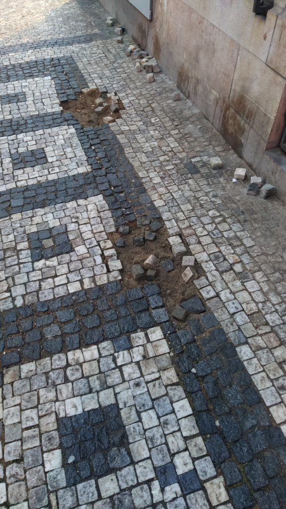 Dvě díry v chodníku, kostky ještě na místě, část bohužel ve vozovce v místě pro cyklisty. Chlumova před Rmosty