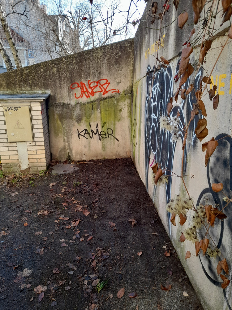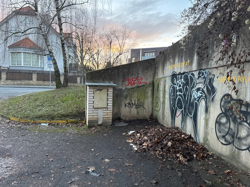 Odpadky a nafoukane listí u opěrné zdi u garáží na křižovatce Plavínová a Pod Lipami. Pozemek HMP v péči Prahy 3.