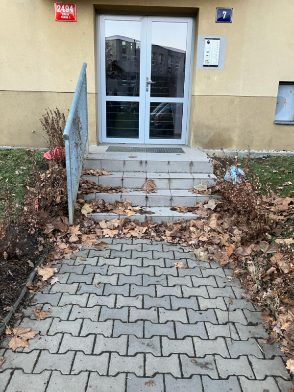 Prosím o úklid navátého listí u všech třech vchodů K Chmelnici 2492,2493,2494. Dle referenta pana Mgr. Melšy mám podnět napsat vám.