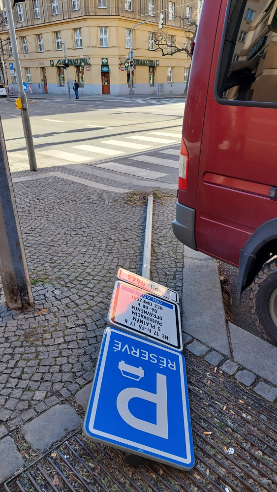 Poškozená značka parkování před restaurací "U Tří prasátek"