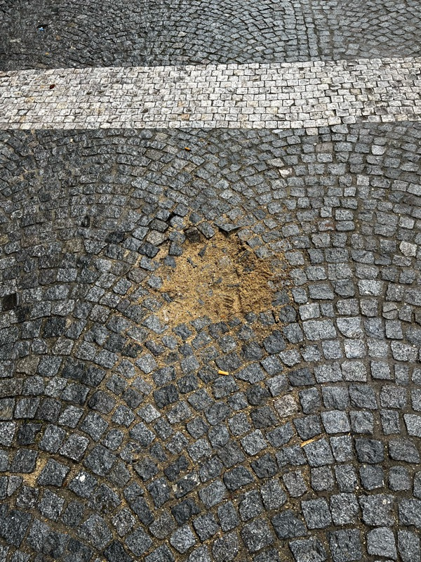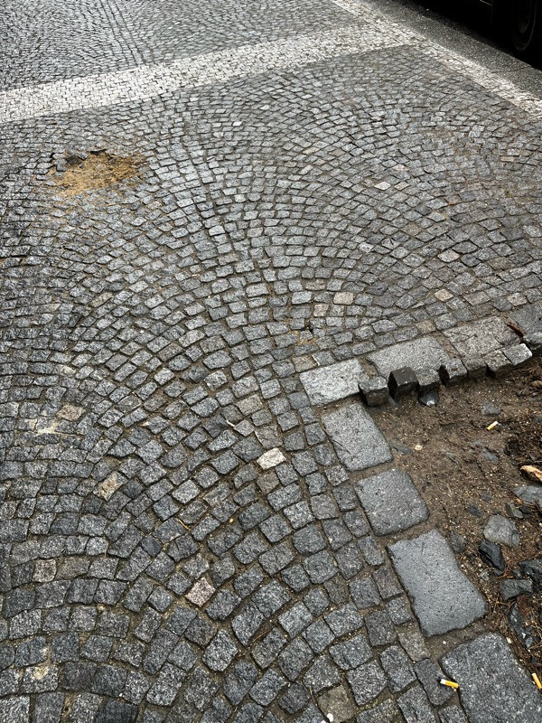 Rozbitý chodník chybí dlažební kostky naproti vinotéky Baranova 6