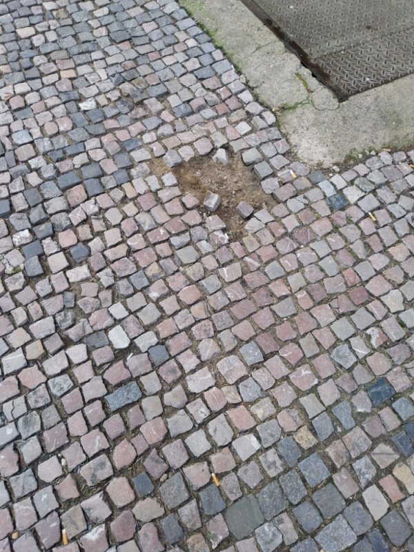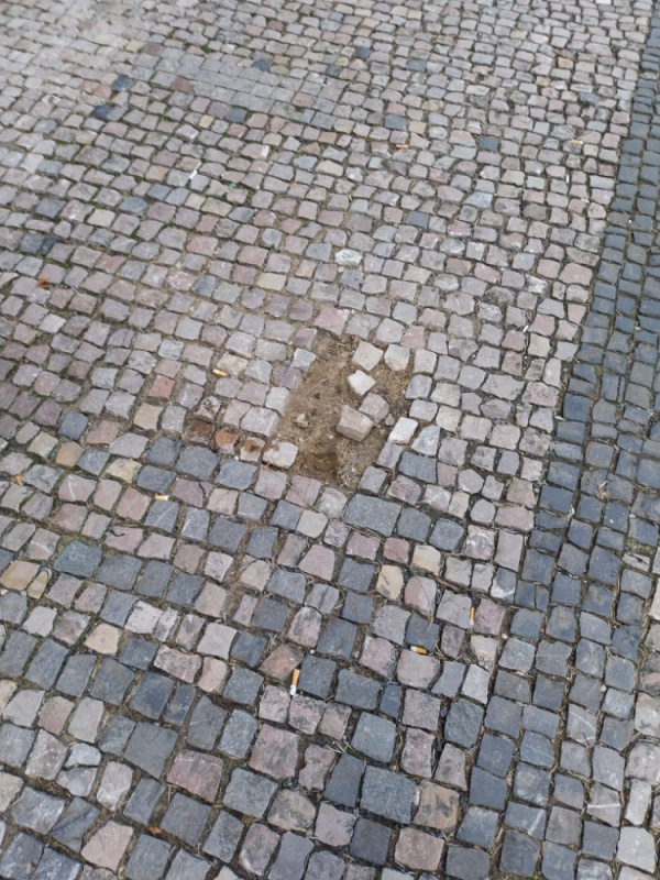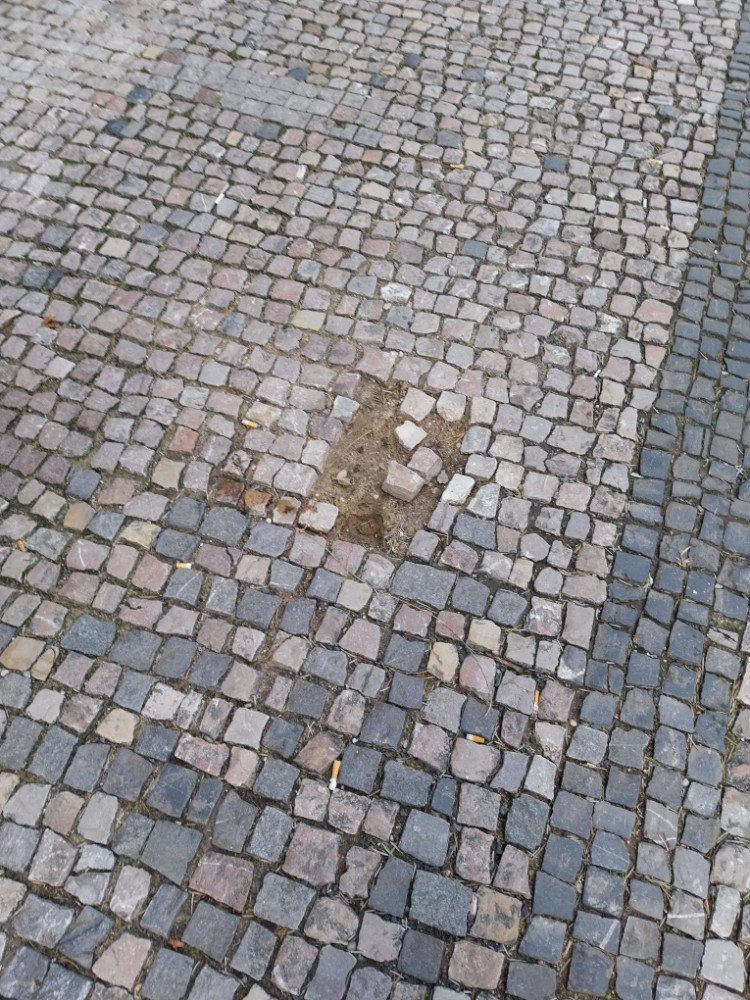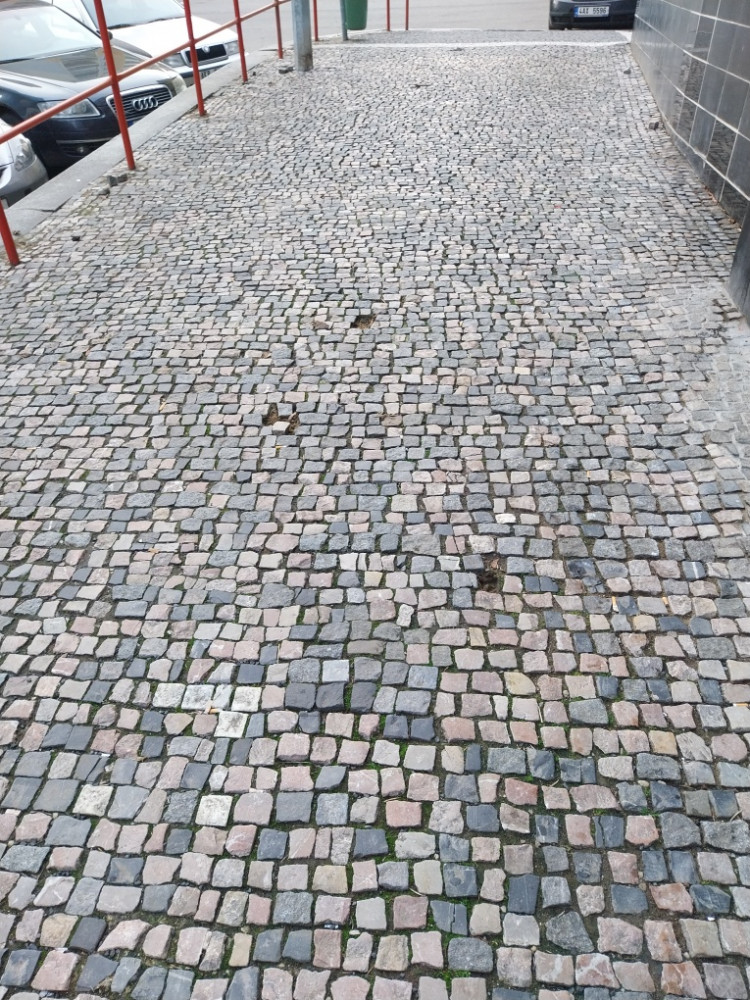 chybějící kostky na chodniku v Sudoměřské u domu č. 11 a 13