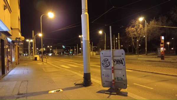 V ulici Hartigova se u lampy 300 218 nachází již půl roku zapomenutá přenosná DZ a navíc jeden podstavec po přenosné DZ.