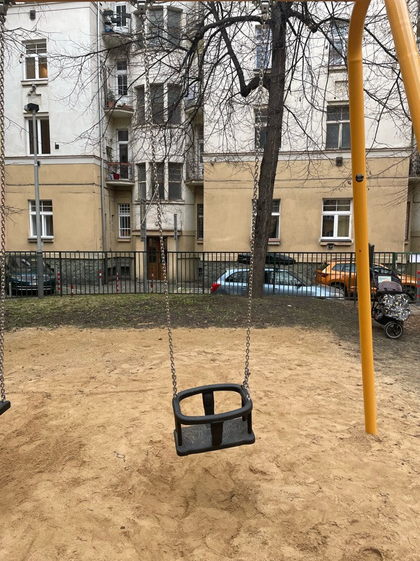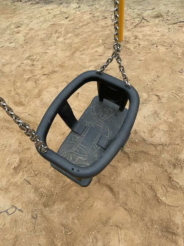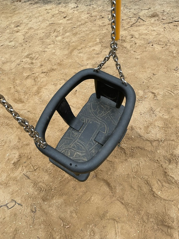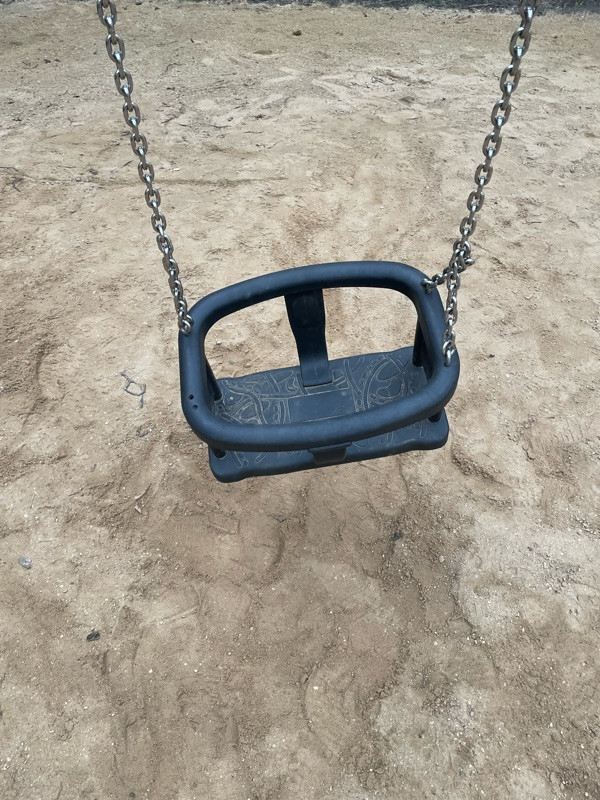 Rozbitá houpačka pro malé děti, urval se tam jeden úchyt řetězu