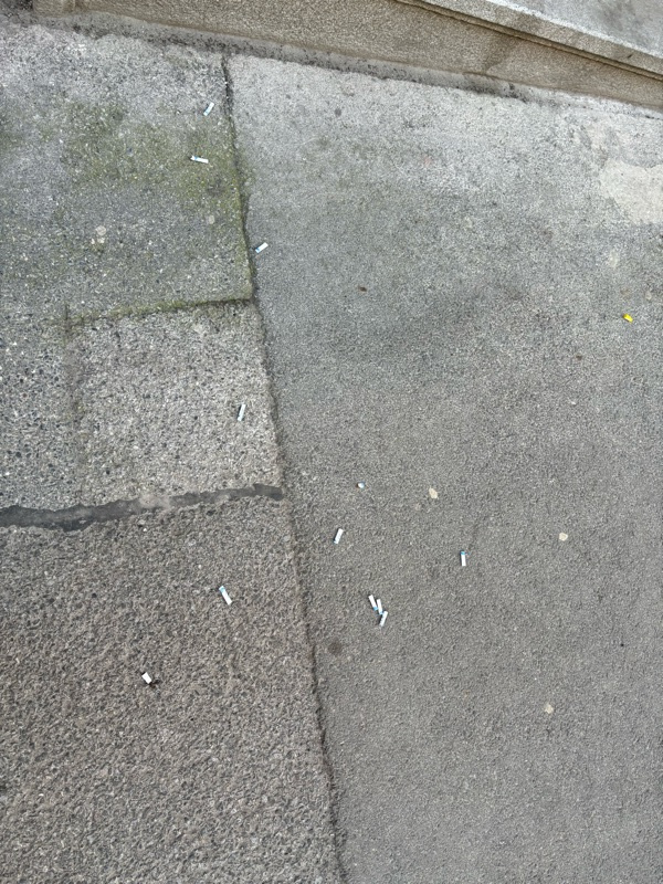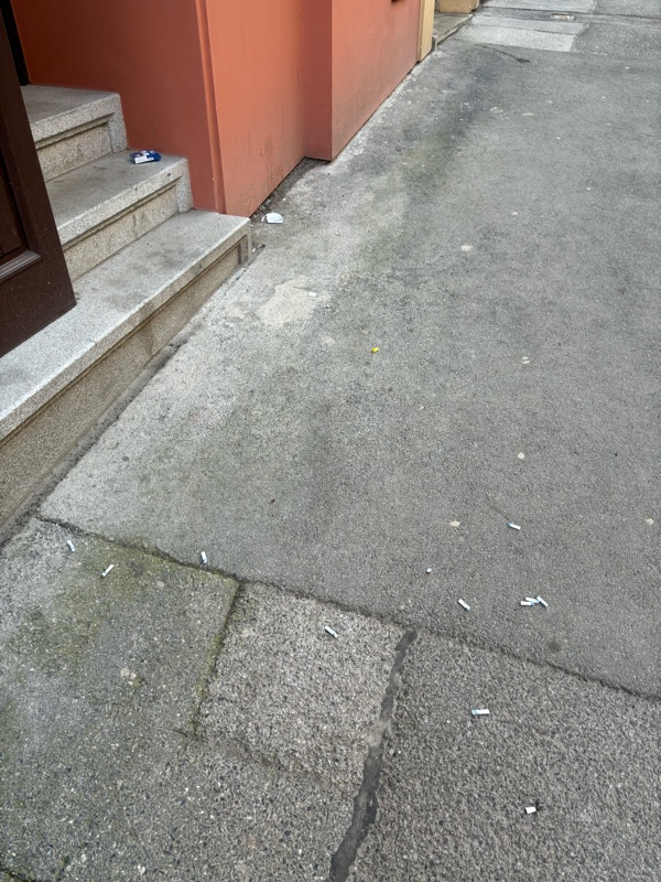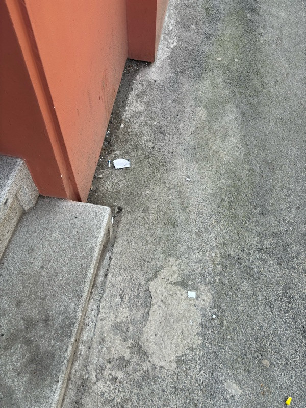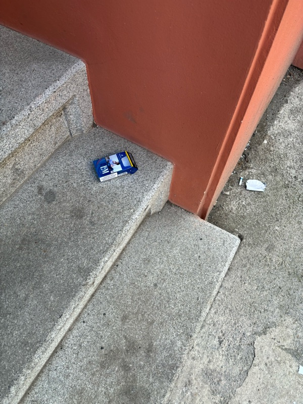 Odpadky na chodníku a na schodišti domu Rehorova 48