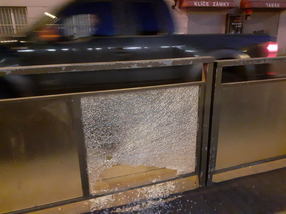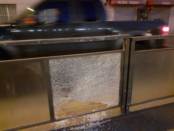 Rozbité sklo u zastávky Vozovna Žizkov ve směru na Spojovací.